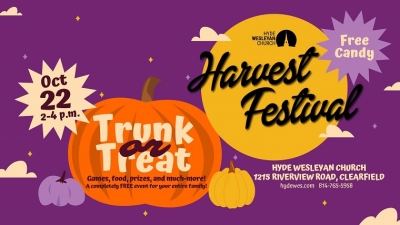 Harvest Fest at Hyde Wesleyan Church Saturday, October 22 from 2-4 PM. We'll have activities for everyone; food, music, kid games, Trunk-or-Treat walkthrough, plenty of candy, and our photo contest! We can't wait to have you join us! Don't forget - everything at Harvest Fest is FREE!
