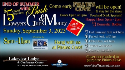 Join us for our End of Summer Bash with classic rock cover band Lawyers, Guns, and Money. Pirates Cove will open early, so visit with friends, enjoy the food and drink specials, and stay for the show. The cover to see the band is only $5.