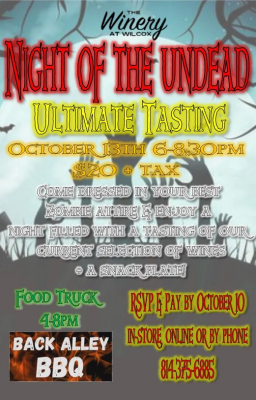 Come dressed in your best zombie attire and enjoy a night filled with tasting of our current selection of wine, plus a snack plate.