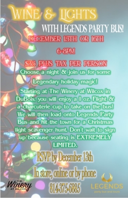Join the Winery at Wilcox and Legends Party Bus for an evening of Wine & Lights! Choose either Friday, December 15th or Saturday, December 16th from 6pm - 8pm. Starting at the Winery at Wilcox in DuBois, guests will enjoy a 1 oz flight and charcuterie cup to take on the bus. Then, guests will get to enjoy a scenic tour of Christmas lights throughout the community on Legends Party Bus! Don't wait to sign up because seating is EXTREMELY LIMITED. RSVPs are due by Wednesday, December 13th. Please pay online, in store, or call 814-375-6885.