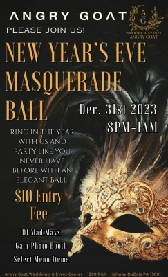 Ring in the year with Angry Goat and party like you never have before with an elegant ball! $10 Entry Fee DJ Mad Maxx Gala Photo Booth Select Menu Items