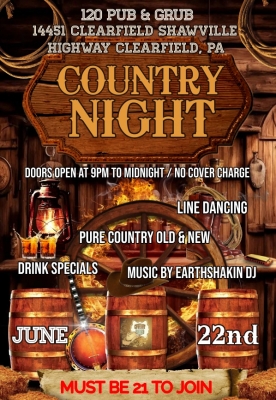 Country Night Doors open @ 9pm To Midnight June 22nd Music by Earthshakin DJ No Cover Charge Line Dancing Pure Country Old N New Drink Specials Must be 21