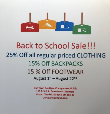 Our Town Boutique Consignment & Gift is having a back to school sale!!