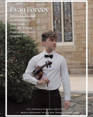 Clearfield, PA – The community is warmly invited to an evening of live music as local violinist Evan Forcey presents a solo recital on Friday, June 27th at 7:30 PM at the Presbyterian Church of Clearfield, located at 119 N 2nd Street, Clearfield, PA.