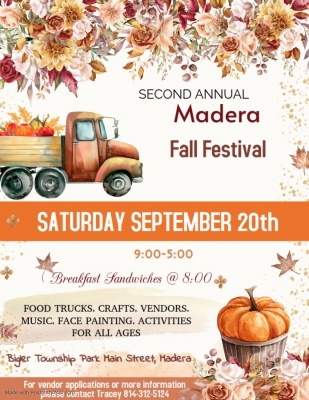 Second Annual Madera Fall Festival, will be held at the Bigler Township Park. All food trucks and vendors are welcome, $25 per spot. Please contact Tracey for an application 814-312-5124.