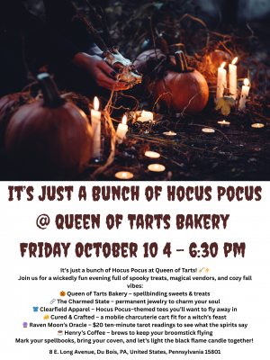 Queen of Tarts Bakery – spellbinding sweets & treats The Charmed State – permanent jewelry to charm your soul Clearfield Apparel – Hocus Pocus–themed tees you’ll want to fly away in Cured & Crafted – a mobile charcuterie cart fit for a witch’s feast Raven Moon’s Oracle – $20 ten-minute tarot readings to see what the spirits say Henry’s Coffee – brews to keep your broomstick flying