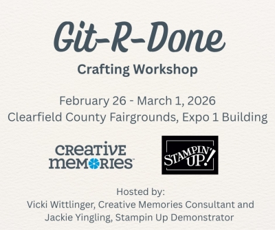 This workshop is hosted by Vicki Wittlinger, Creative Memories consultant and Jackie Yingling, Stampin’ Up! demonstrator. There will be products for sale along with goodie bags and prizes.
