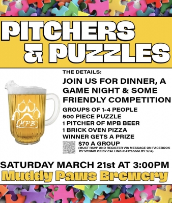 Who loves a little friendly competition? Join us on Saturday March 21st at 3PM for MPB’s 1st Pitchers & Puzzles! This fun evening will include: 1 pitcher of beer, 1 brick oven pizza and 1 puzzle per group of 1-4 people. TAG your friends who would love to join you at this event. Your registration must be completed by 3/14 to give us enough time to order the puzzles. The group to complete the puzzle the fastest will win a prize! SIGN UP TODAY as spots will be limited!